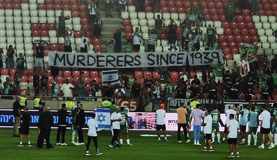 根据波兰媒体公开的图片和视频,部分以色列球迷在与切琴托霍瓦的比赛中,展示了一条用英文写着“自1939年以来的凶手”的巨大横幅。